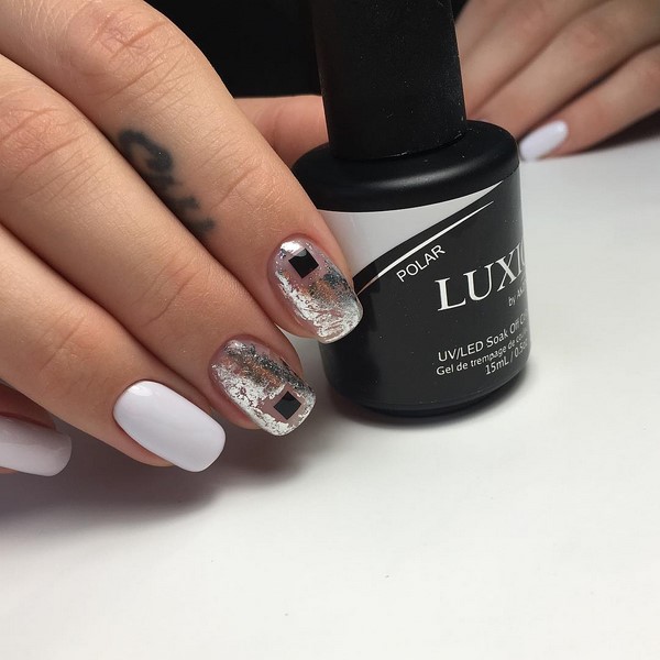 Utilisez la feuille d'aluminium sur un doigt et couvrez-la complètement avec votre doigt ou des morceaux du curseur de feuille d'aluminium sur deux doigts pour créer l'emphase nécessaire. Une si belle manucure blanche avec feuille 2025-2026 ne passera pas inaperçue, croyez-moi!