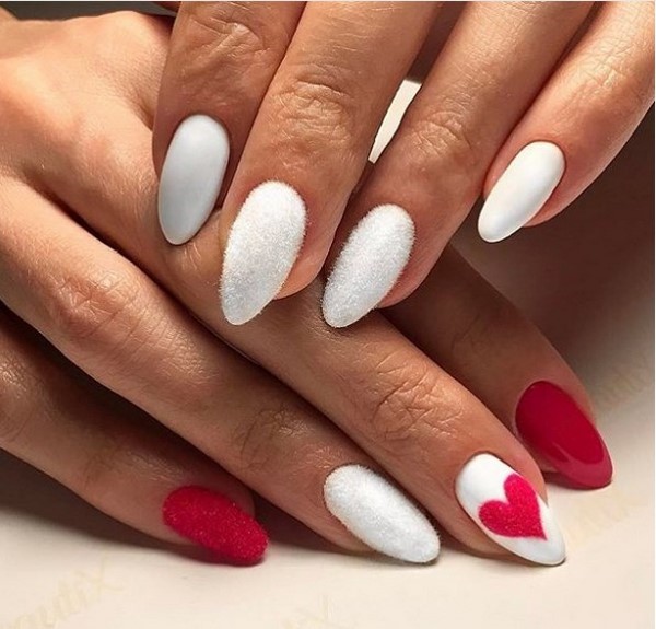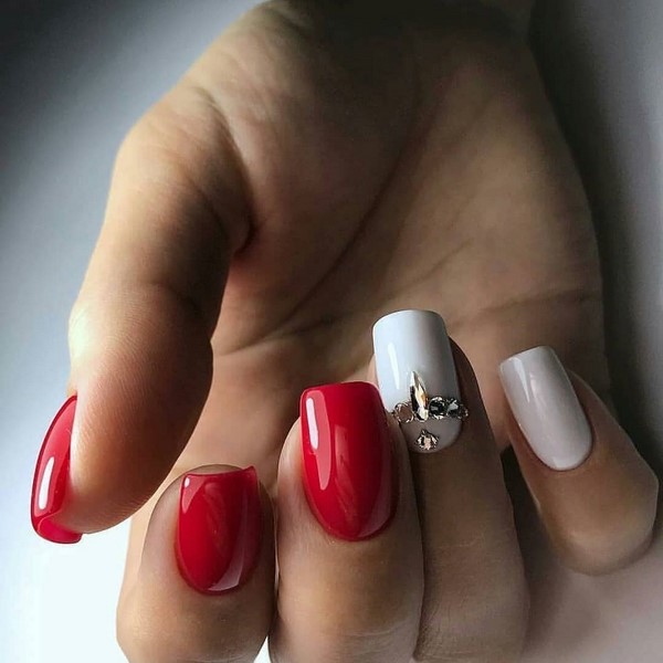 Utilisez des strass et des sculptures, des bandes de papier d'aluminium ou tracez des lignes fines qui rendront la manucure rouge-blanche encore plus charmante. Voir les idées de conception des ongles rouges et blancs dans la photo ci-dessous.