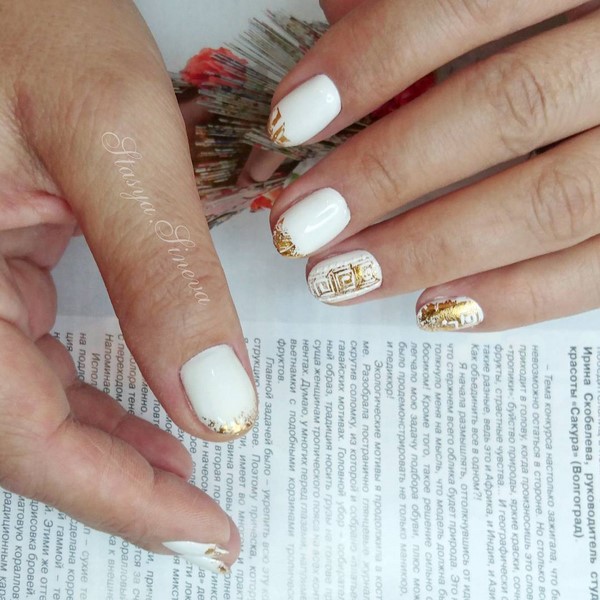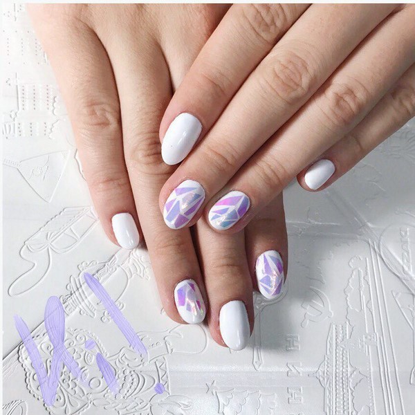 Utilisez la feuille d'aluminium sur un doigt et couvrez-la complètement avec votre doigt ou des morceaux du curseur de feuille d'aluminium sur deux doigts pour créer l'emphase nécessaire. Une si belle manucure blanche avec feuille 2025-2026 ne passera pas inaperçue, croyez-moi!
