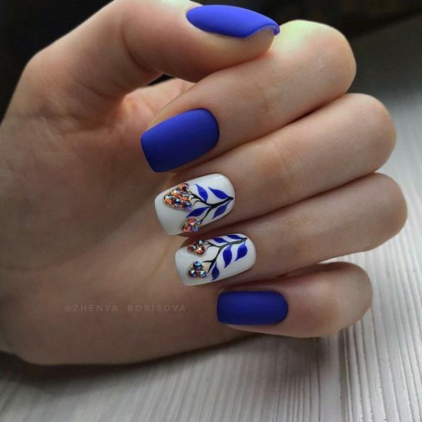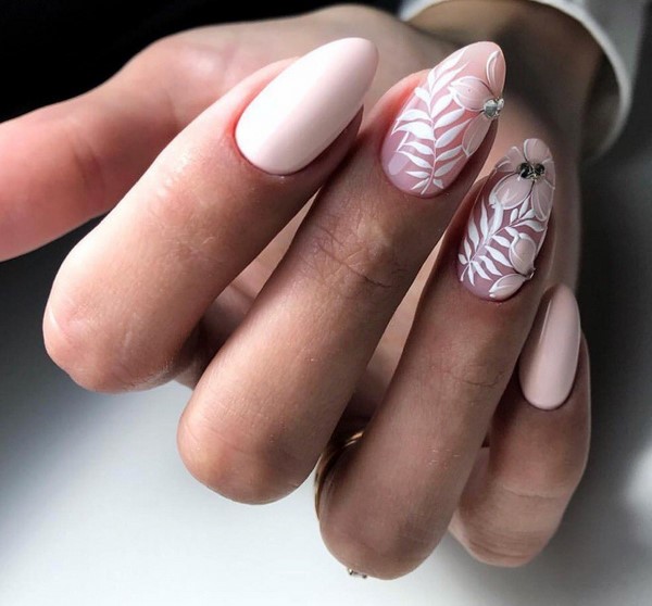 En plus des petits dessins en couleur, vous pouvez rencontrer des peintures complexes avec des fleurs sur des ongles blancs. Ces impressions peuvent être complétées par des strass et des cailloux, ce qui ajoutera des notes de glamour et de luxe à la manucure blanche.