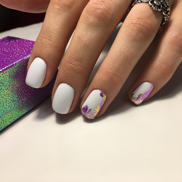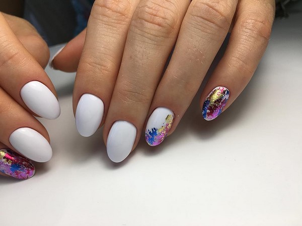 Des morceaux de papier d'aluminium sur les ongles sont un autre art incontournable de la technique des ongles 2025-2026, qui doit être testé. Une manucure non triviale avec un vernis blanc et un film argenté ou doré ou même des morceaux de papier multicolores - elle est tellement élégante et spectaculaire.