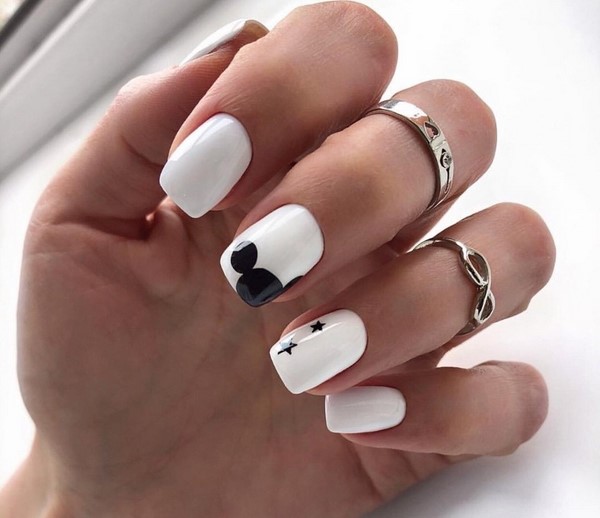 Vous pouvez obtenir de jolis ongles en noir et blanc à l’image d’animaux de dessins animés et d’objets insolites, tels que des oreilles de Mickey Mouse ou des épingles d’ongles blancs. Rayures et traits, boucles et zigzags, peintures ethniques, échiquiers, motifs de marbre noir et blanc - tout cela est dans la tendance de la manucure 2025-2026.