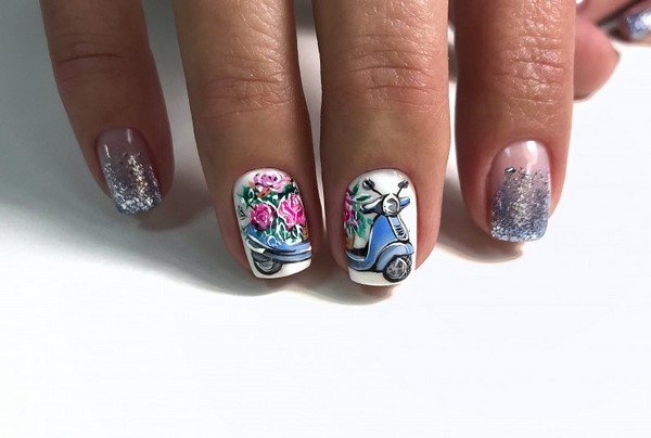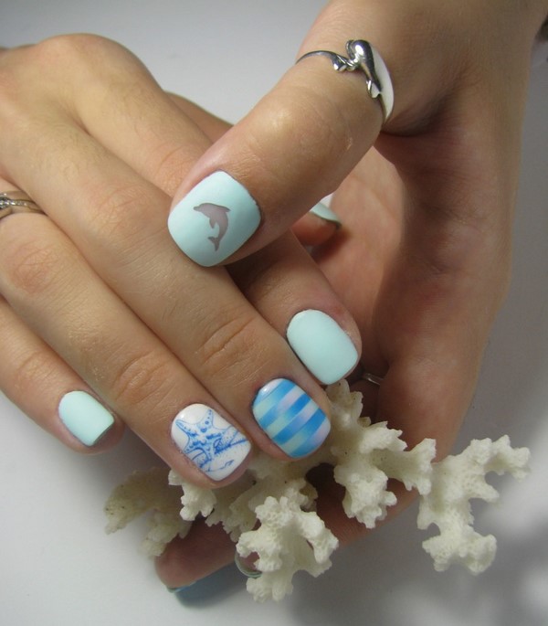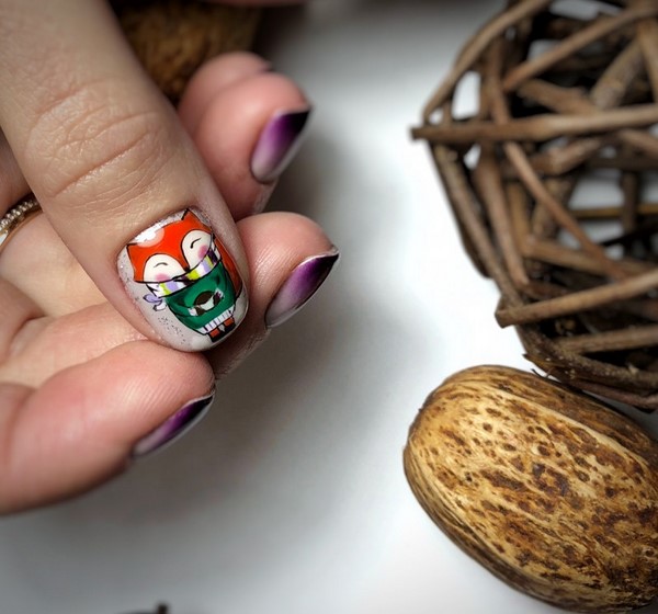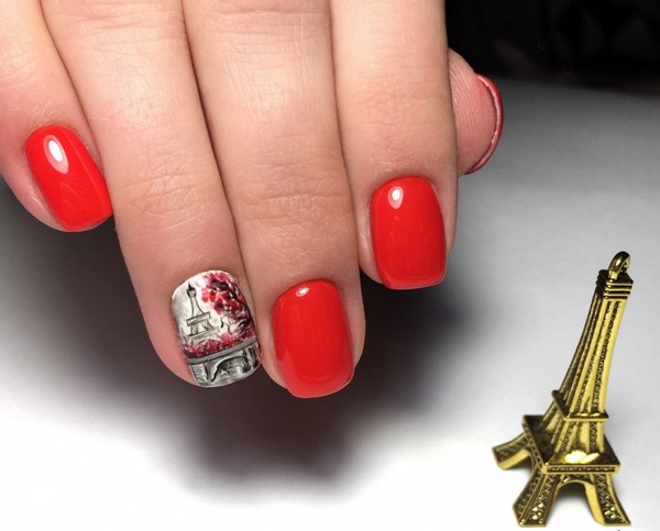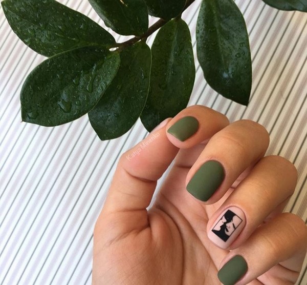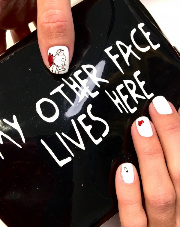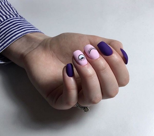En considérant les idées chics des ongles courts avec du nail art à la mode, on ne peut que prêter attention aux top designs avec l’image des filles - portraits et visages, silhouettes et yeux avec cils et lèvres lumineuses qui ont l’air si inhabituel et merveilleux sur les ongles courts. Vous pouvez créer des dessins sur des ongles courts sur une paire de doigts ou sur un pouce et une couche de couleur sur le reste.