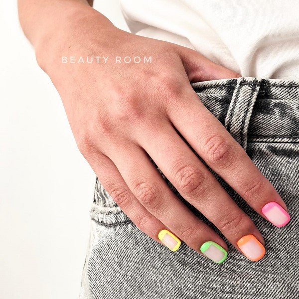 Les ongles courts à la mode ont une allure très harmonieuse avec le design à «espace négatif», ce qui vous permet de créer un design d’ongles courts plus élégant et décontracté. De beaux dessins de clous courts sont représentés avec une géométrie, des trous, une finition mate et des dessins sur un revêtement transparent dans le style de l'espace négatif.