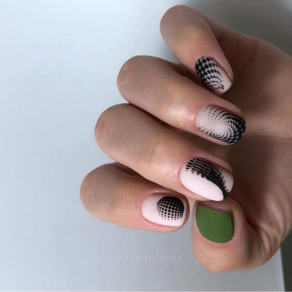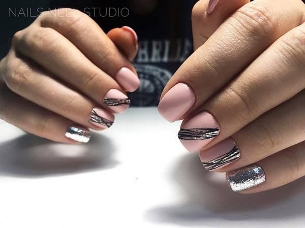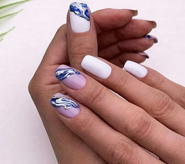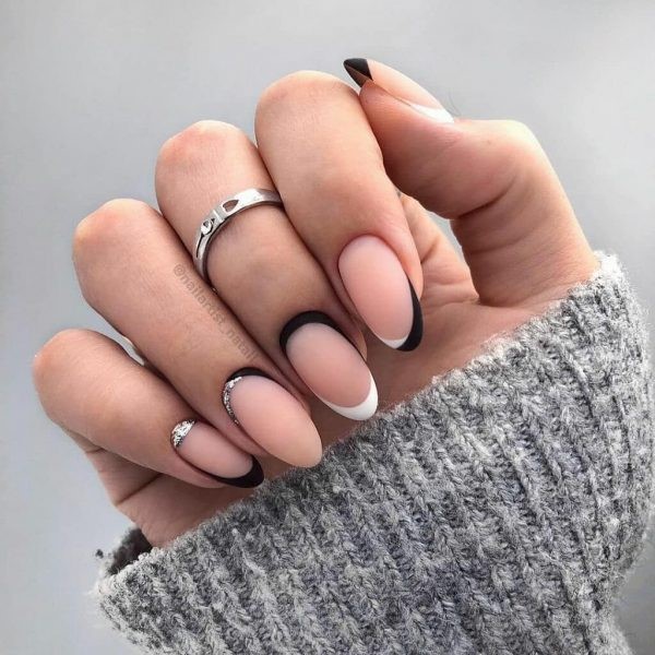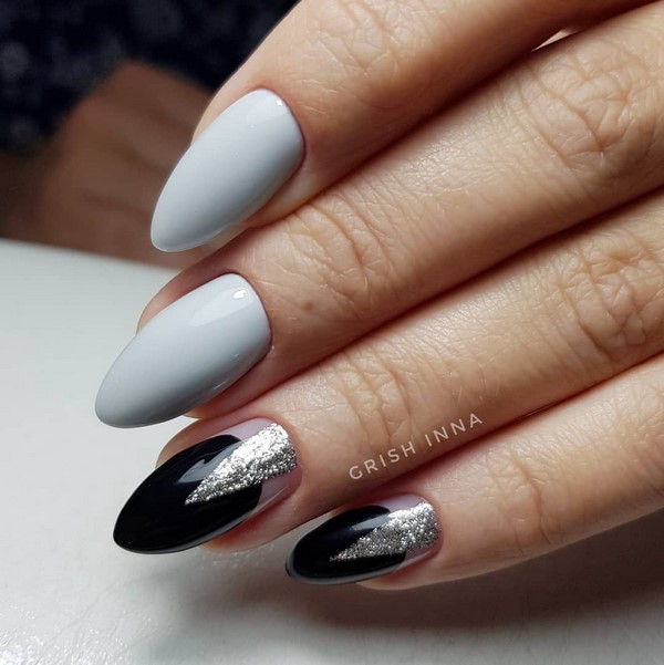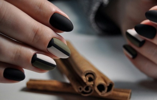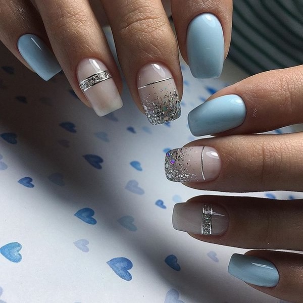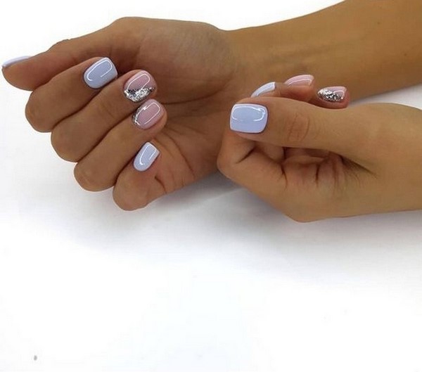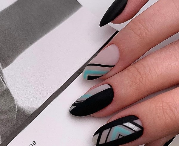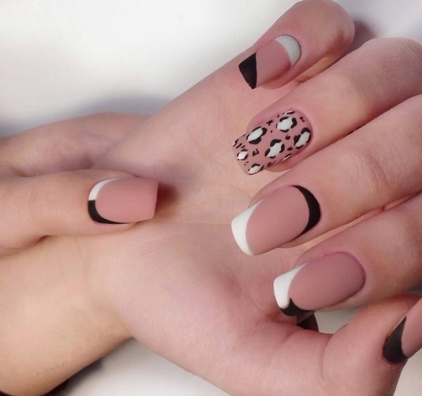 Vous pouvez combiner de beaux ongles, par exemple, rouge et noir, beige et bleu, jaune et rose, gris et huile, bleu et poudre, argent et bleu, etc., en combinant un motif bicolore avec des éléments contrastants blancs, noirs et métalliques. .