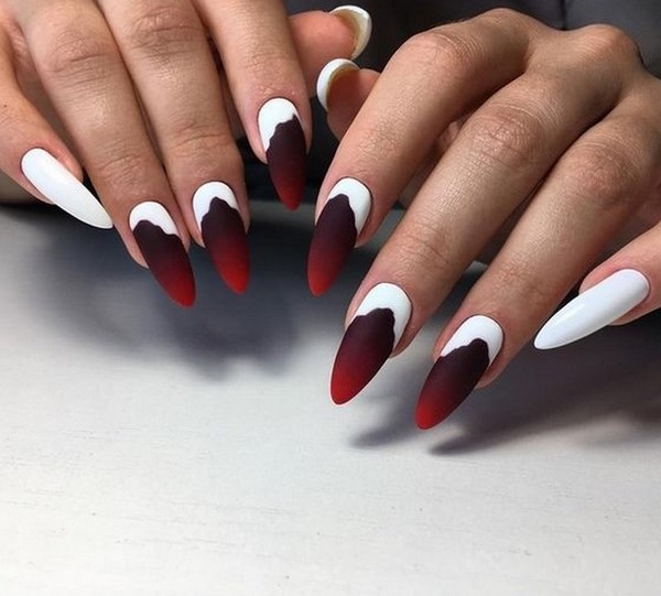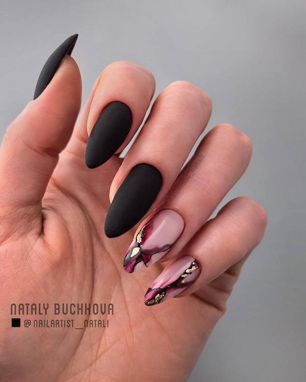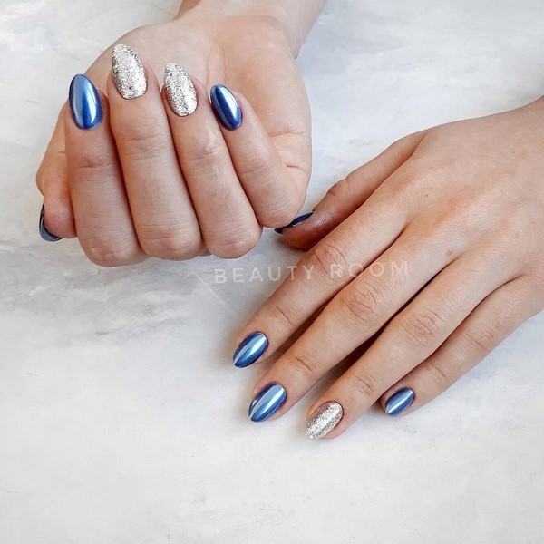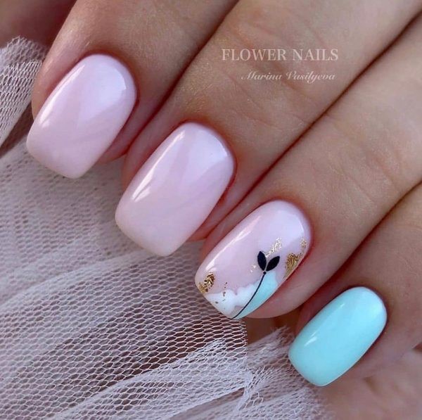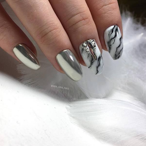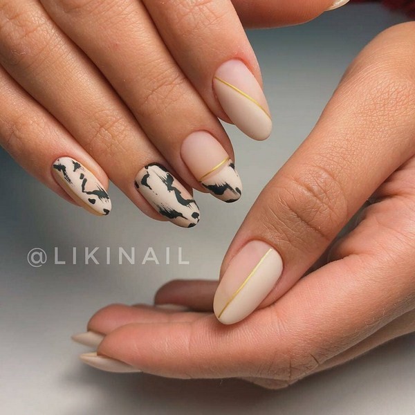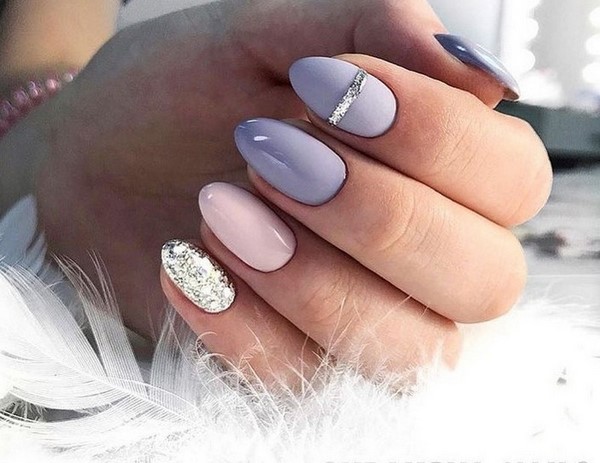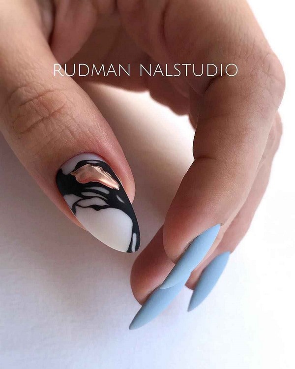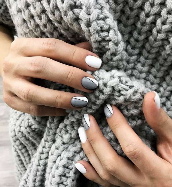 Vous pouvez combiner de beaux ongles, par exemple, rouge et noir, beige et bleu, jaune et rose, gris et huile, bleu et poudre, argent et bleu, etc., en combinant un motif bicolore avec des éléments contrastants blancs, noirs et métalliques. .