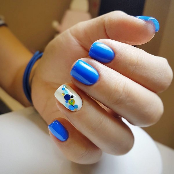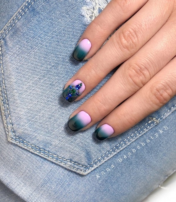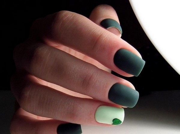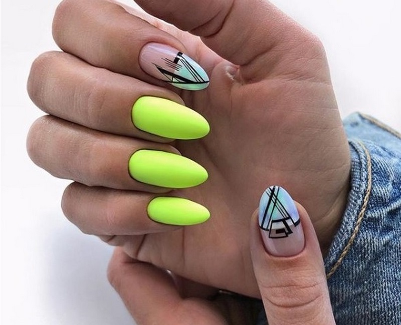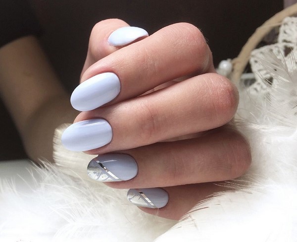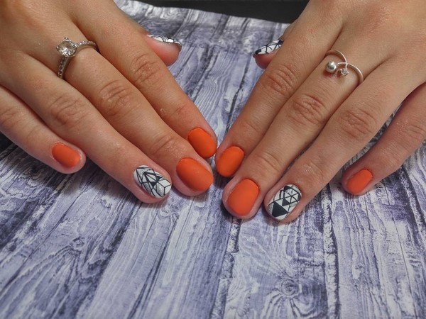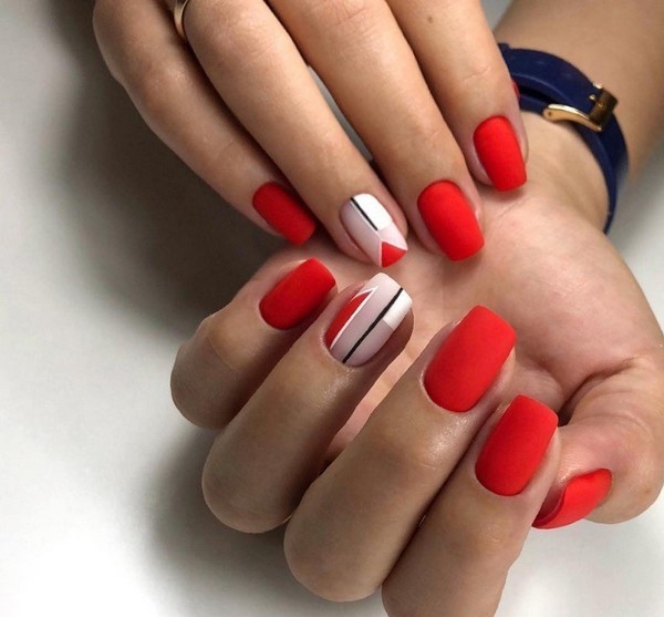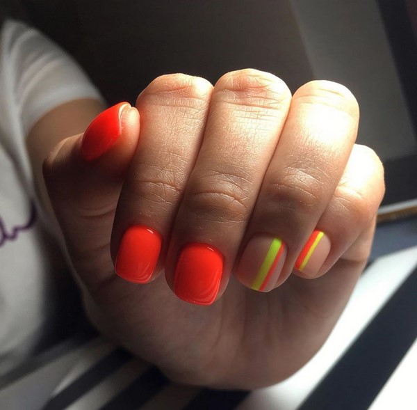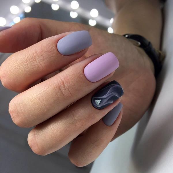 Les ongles Trend, dans lesquels une plaque à ongles est peinte de deux couleurs, peuvent être aussi concis que possible, divisés par une bande, une figure géométrique, un motif ou un décor de la troisième couleur.