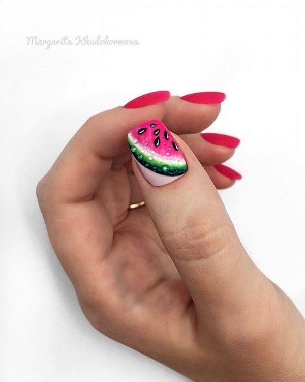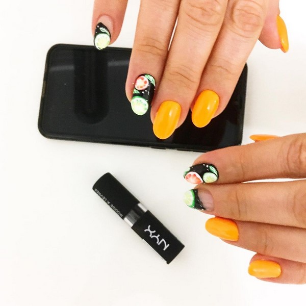 Une manucure à la mode avec des fruits et une toile d'araignée qui est combinée à des ongles blancs monotones est également complétée par un motif lumineux en forme de taches qui soutient le thème général de la palette de couleurs du nail art.