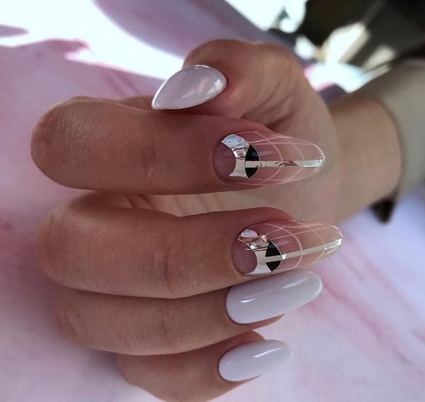 Un ornement ou un dessin qui représente la géométrie et le minimalisme sur les ongles peut être coloré, chatoyant, non peint et également combiner plusieurs éléments en même temps.