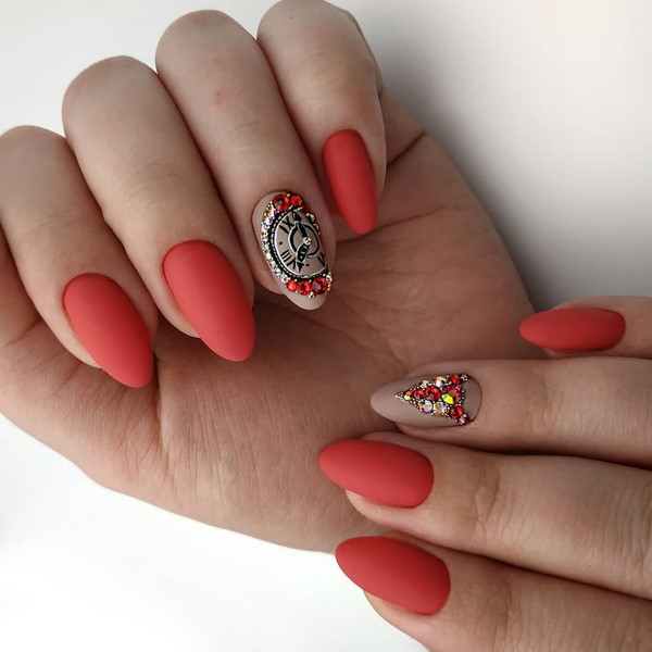Une telle manucure rouge semble non seulement très sophistiquée, mais aussi chère. La manucure rouge mat peut être non seulement monophonique, le maître en nail art vous conseillera une manucure rouge à base mate avec une variété de motifs, motifs, fleurs, paillettes.