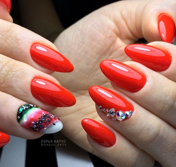 Toute manucure rouge aura l’air superbe si elle est complétée par l’idée originale de la conception des ongles.