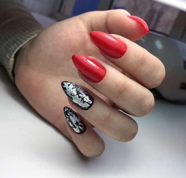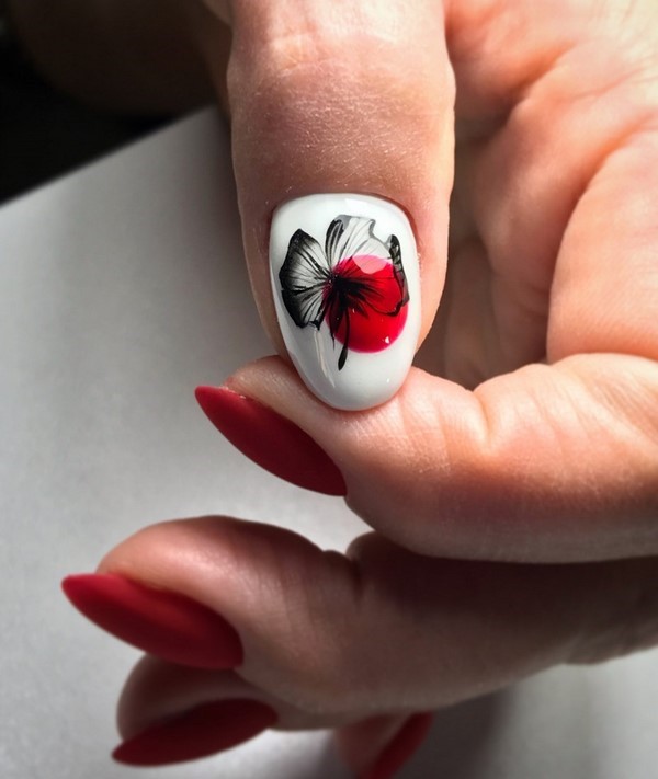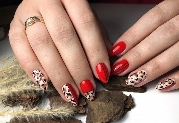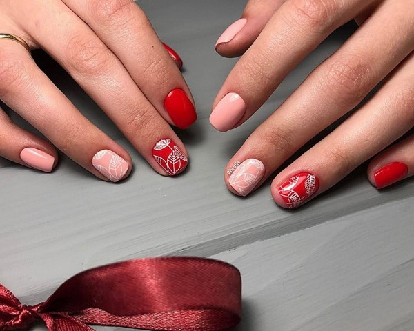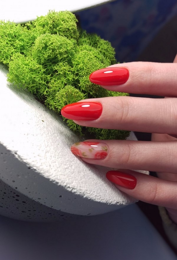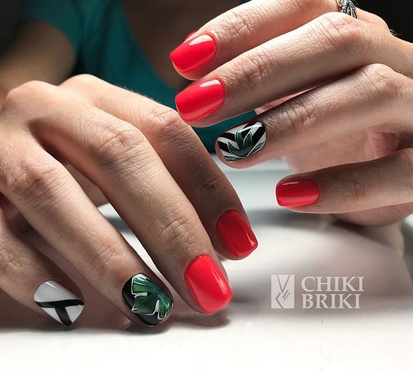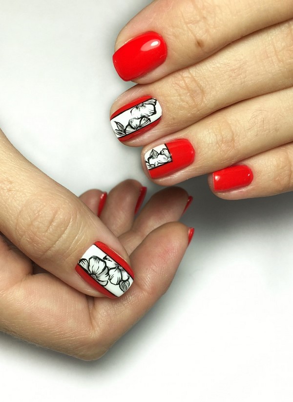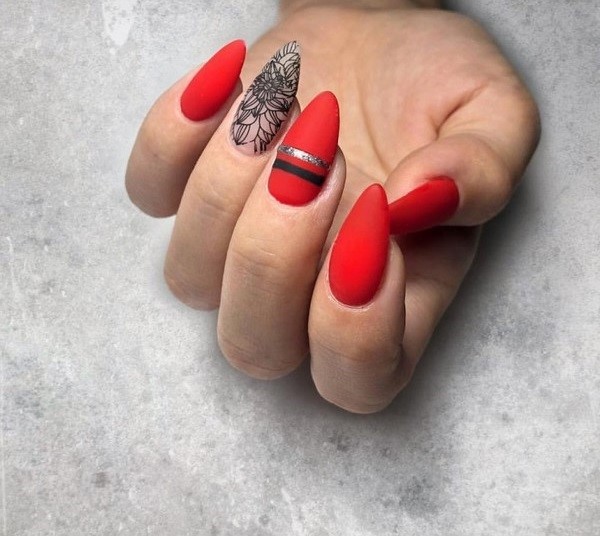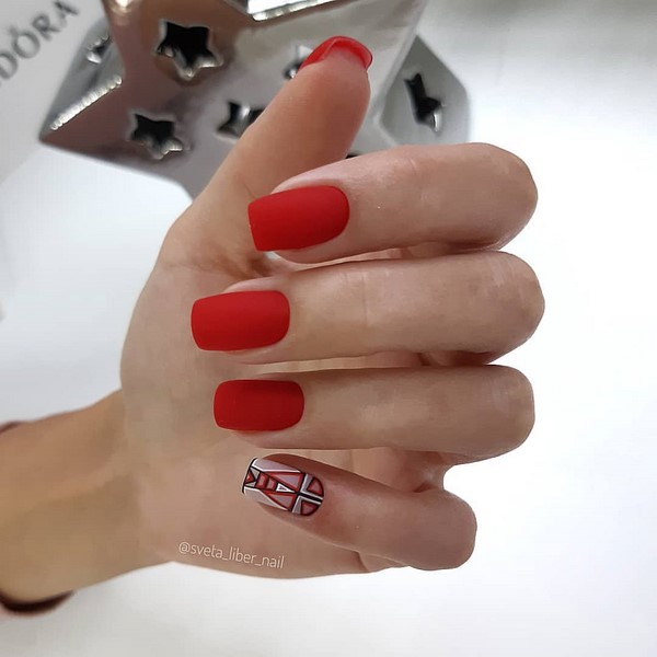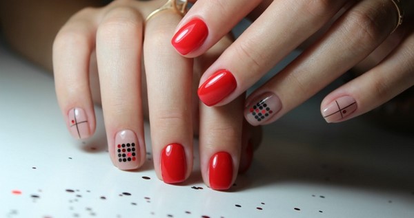 Et ce n’est pas seulement une manucure rouge unie. Les fashionistas peuvent apprécier la manucure rouge monochrome en combinaison avec un imprimé abstrait et géométrique, des motifs complexes sur un ou deux clous, une élégante manucure rouge avec un imprimé floral.