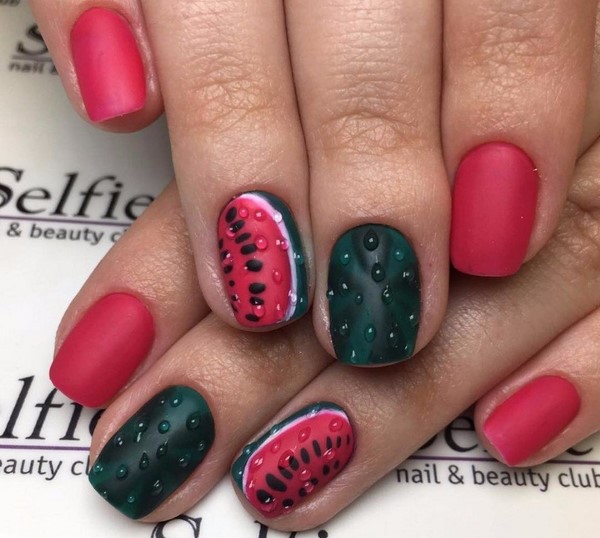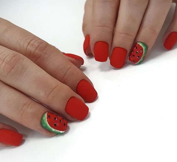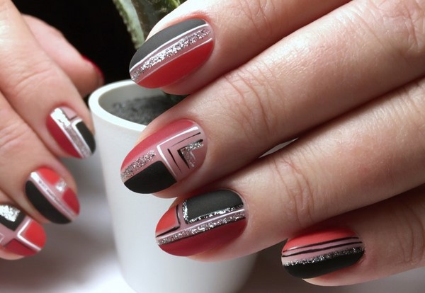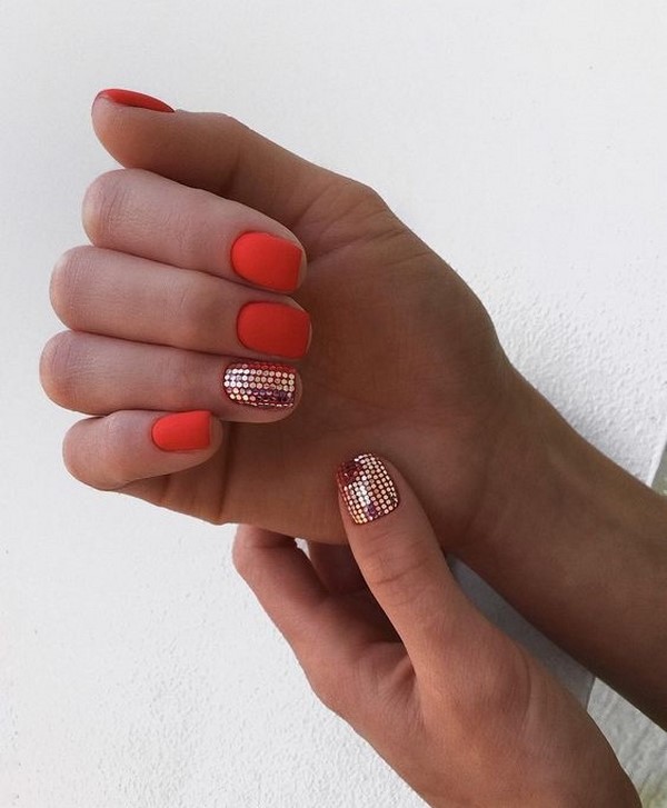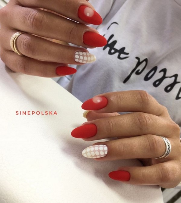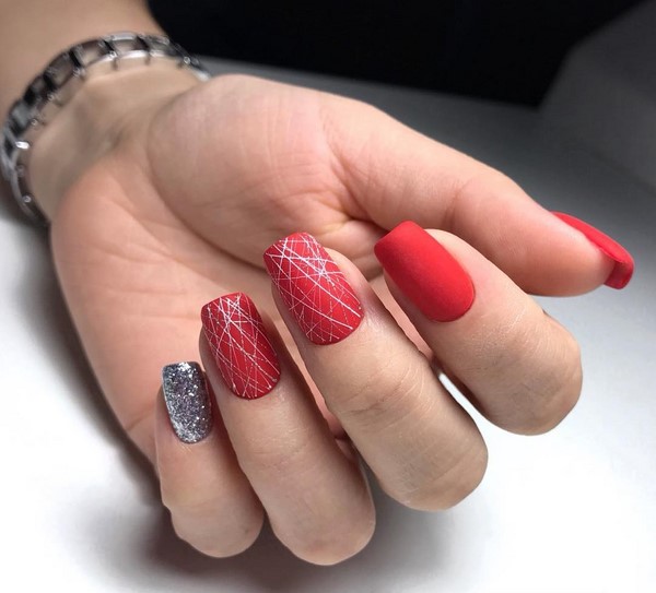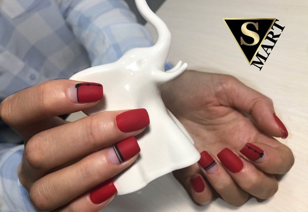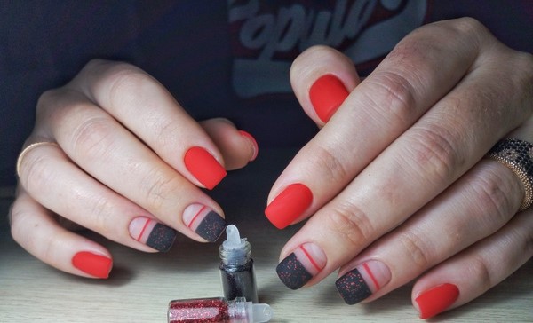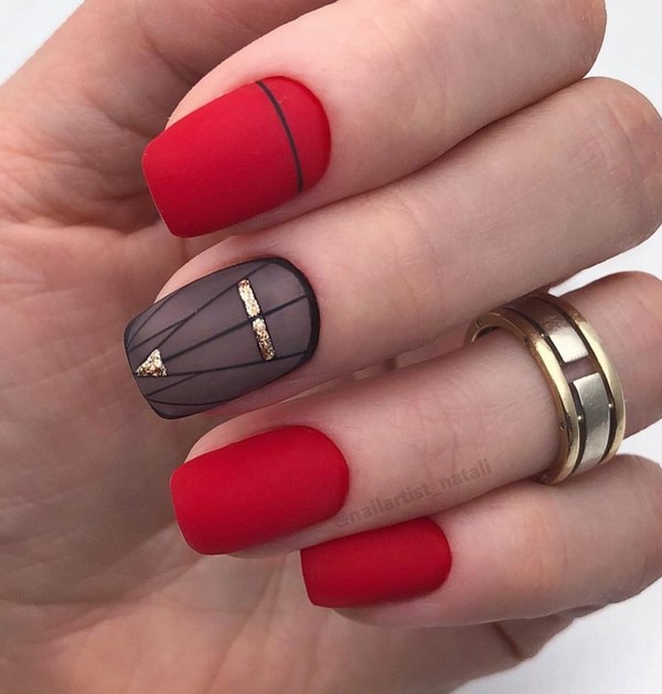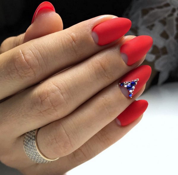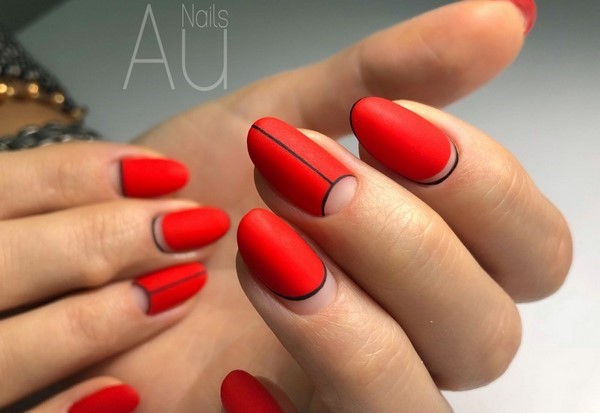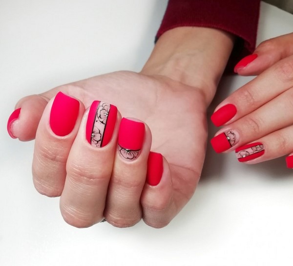 Une telle manucure rouge semble non seulement très sophistiquée, mais aussi chère. La manucure rouge mat peut être non seulement monophonique, le maître en nail art vous conseillera une manucure rouge à base mate avec une variété de motifs, motifs, fleurs, paillettes.