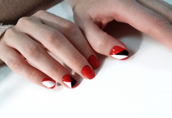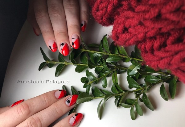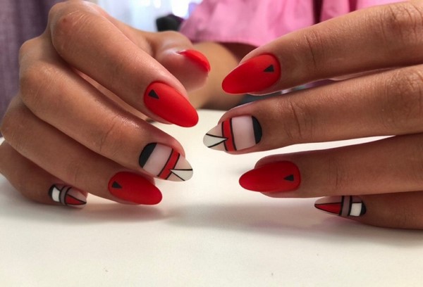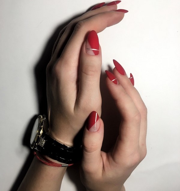 Récemment, une manucure rouge lunaire avec une forme triangulaire du trou est devenue populaire. Des lignes géométriquement correctes rendront la manucure rouge concise, mais en même temps très originale.