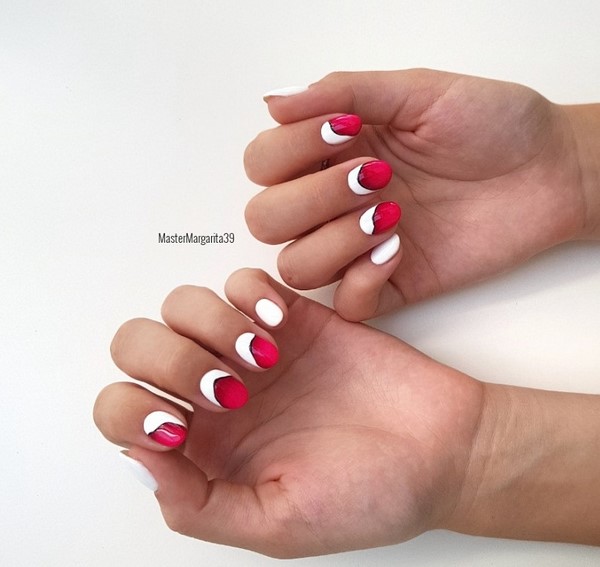 La prochaine technique, qui diversifiera votre manucure rouge à la mode avec de nouvelles solutions, sera la conception des ongles en forme de lune.
