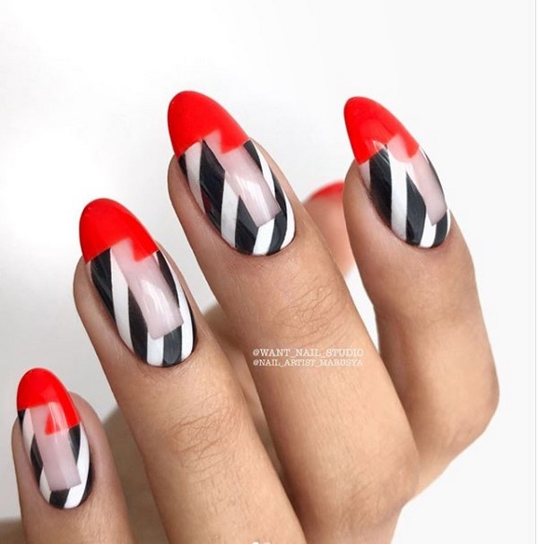 Une manucure rouge française avec une base transparente et une bande rouge aura l'air chic si vous décorez une manucure rouge avec un motif.