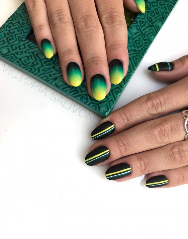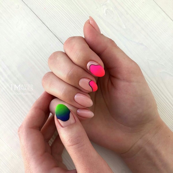 Le charme de la manucure ombrée est en demande à chaque saison, ce que nous vous avons rappelé à plusieurs reprises, comme preuve de cela - de nouvelles idées ombrées pour l’été émanant de grands gourous.Ces lignes de dégradé, combinant ombre avec «espace négatif» et ombre «néon» pour l'été sur les ongles en forme d’îles, vous permettront de briller avec un design d’été luxueux.