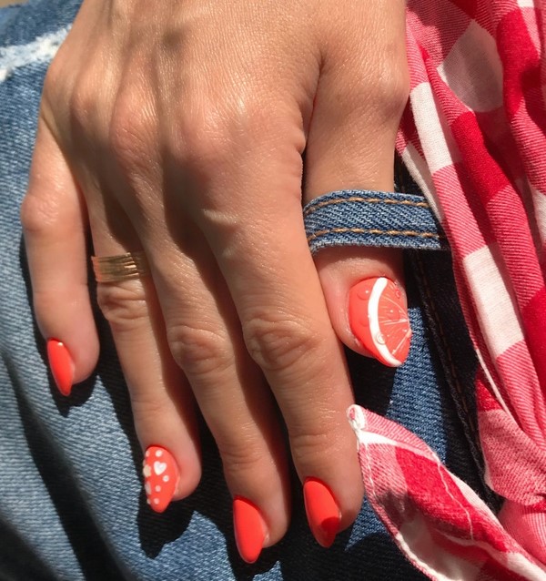 Le minimalisme en tant que tendance principale de la conception des ongles à la mode sera magnifique dans la conception des ongles en été avec des designs sophistiqués. Pour créer un dessin d’ongle minimaliste à la mode pour l’été, il suffit de faire un petit dessin sur l’un des doigts: il peut s’agir de points, de traits, d’abstractions, de graphiques, de fleuristes et d’autres mini-dessins pour une manucure estivale à la mode.