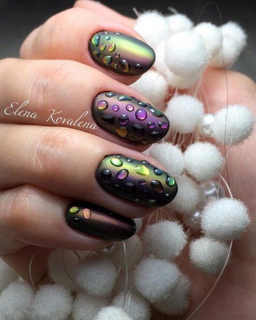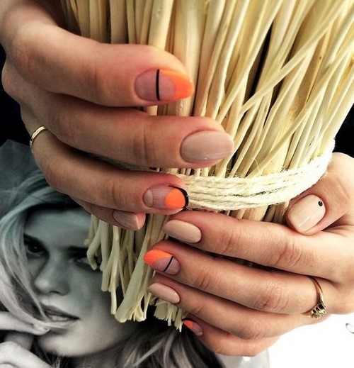 Les techniques novatrices qui nous sont parvenues au cours de la nouvelle saison sont illustrées par la photo d’une manucure à espace négatif. Les dessins avec de la fumée, des toiles d’araignée, des motifs de pois combinés avec des rayures, des étincelles, etc. ont créé une nouvelle atmosphère.