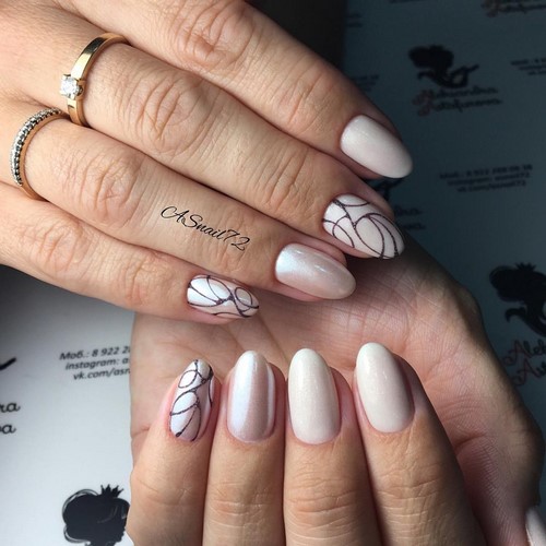 Un dessin étiré sur tous les ongles, de jolies tiges, des motifs délicats sous forme de lignes ondulées et verticales et l’absence d’éléments volumineux - ce qui peut être idéal comme option universelle.