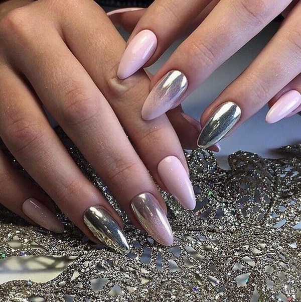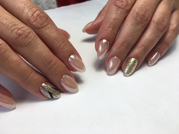 Les maîtres de Neil ont plusieurs façons de créer de la brillance et du chic sur leurs doigts, et l’une d’elles peut se frotter. Perle, holographique, miroir et autres types de frottements ont la capacité de créer de merveilleux débordements sur les ongles, qui sont si beaux dans le nail art du nouvel an. Nous vous suggérons de prendre la teinte douce du vernis et de créer un effet de miroir dégradé en utilisant un frottement, comme indiqué sur la photo. Le reflet brillant de vos doigts et la manucure pour le Nouvel An 2026 attireront certainement l’attention, et vous ne serez pas laissé sans attention!