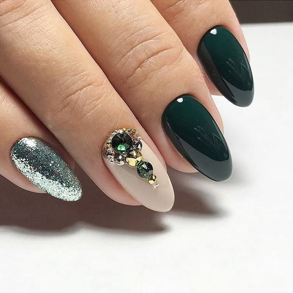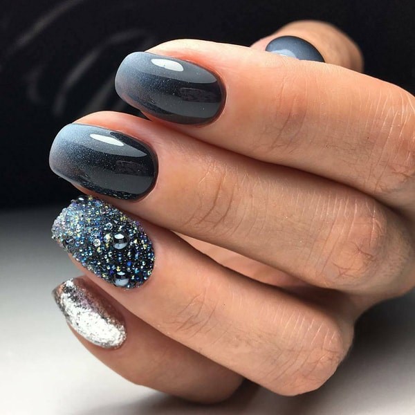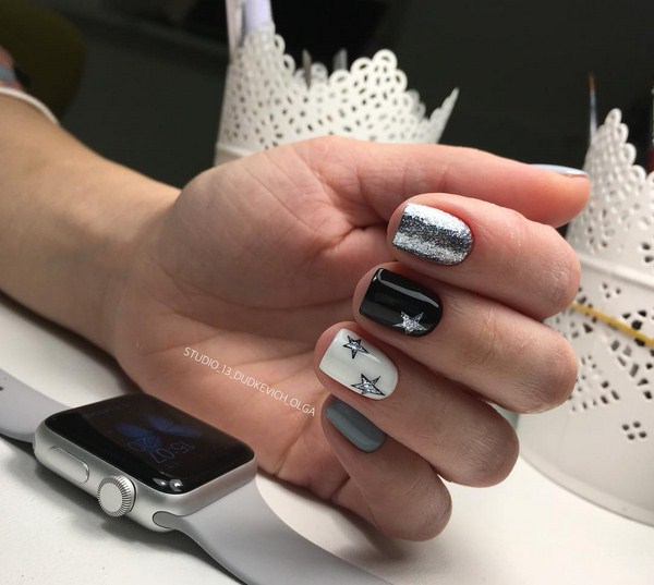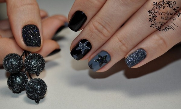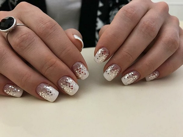 Incroyablement belle manucure du Nouvel An est, tout d'abord, beaucoup de brillance et de particules scintillantes, ce qui donne la manucure solennelle et convaincante à la veille du Nouvel An.