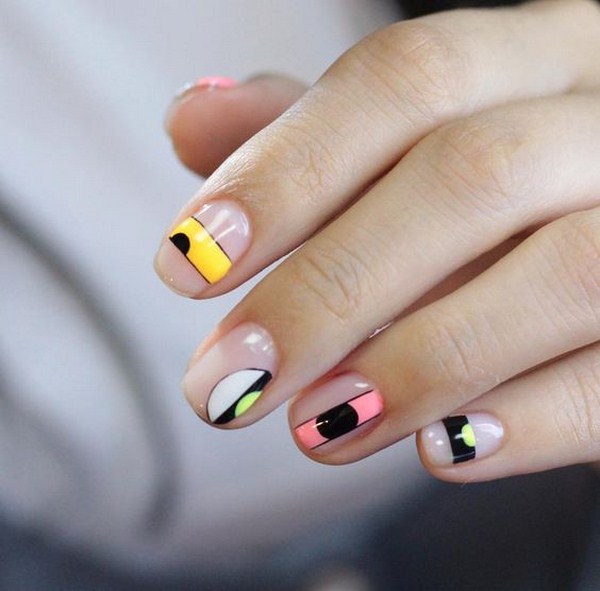 Des combinaisons contrastées et lumineuses de tons de manucure avec des rayures aideront à créer un «bloc de couleurs» coloré et accrocheur, qui attirera l'attention sur vos doigts et ne laissera certainement personne impartial. Une telle manucure avec des lignes est belle pour les regards d'été brillants et irrésistibles.