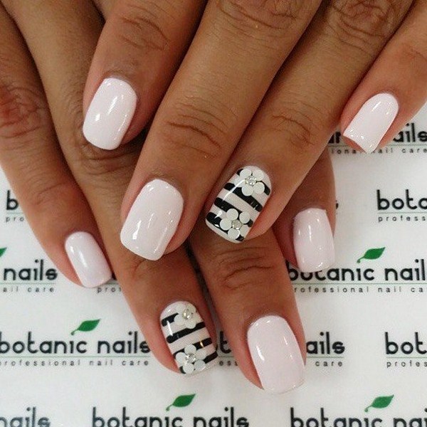 La manucure professionnelle pour le bureau avec des rayures rose pâle, beige, lait, ainsi que des rayures noires avec des rayures blanches ou noires contrastant avec le ton de base de l’enduit deviendra très utile pour les femmes d’affaires.