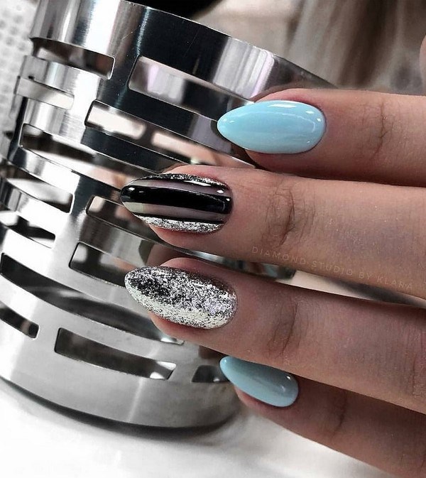Une manucure sans égal et solennelle avec des rayures en forme de galets et divers types d’étincelles, une brillance de métal et une feuille permet de donner aux arcs du soir une complétude et une sophistication sans kitsch inutile dans une performance exquise.