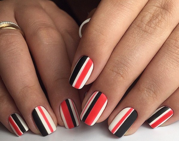 Des combinaisons contrastées et lumineuses de tons de manucure avec des rayures aideront à créer un «bloc de couleurs» coloré et accrocheur, qui attirera l'attention sur vos doigts et ne laissera certainement personne impartial. Une telle manucure avec des lignes est belle pour les regards d'été brillants et irrésistibles.