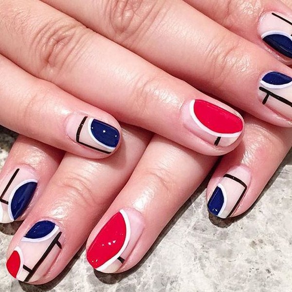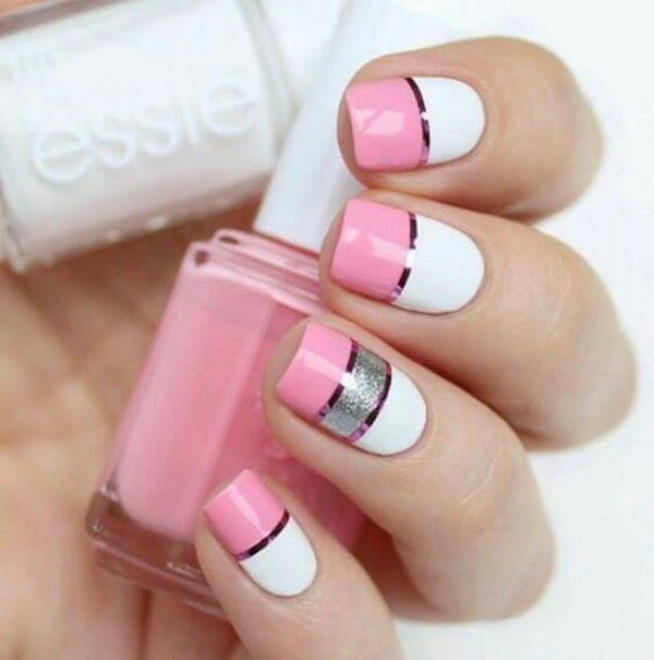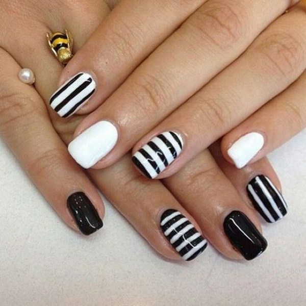 La combinaison de plusieurs bandes dans un même design contribuera à changer radicalement l’impression de nail art en bandes, en tant que telle. Des lignes perpendiculaires, diagonales se coupant, des formes et des zigzags variés peuvent donner une originalité au nail art habituel.