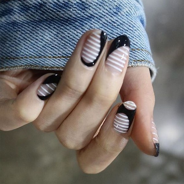 Un nail art à rayures intéressant peut être un élément de tout type de manucure que vous aimez - design géométrique, espace négatif, minimalisme, nail art français et lune, avec des cailloux, des paillettes et tout autre décor.