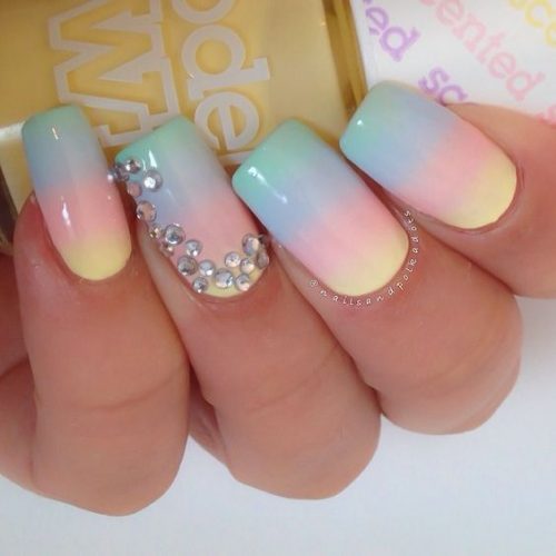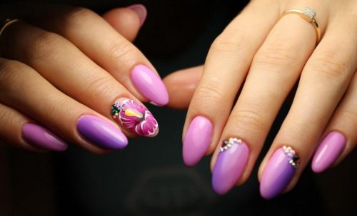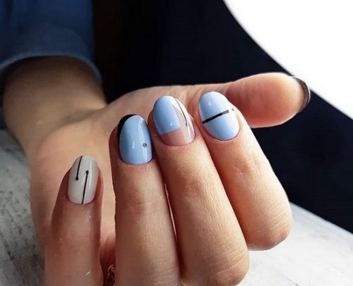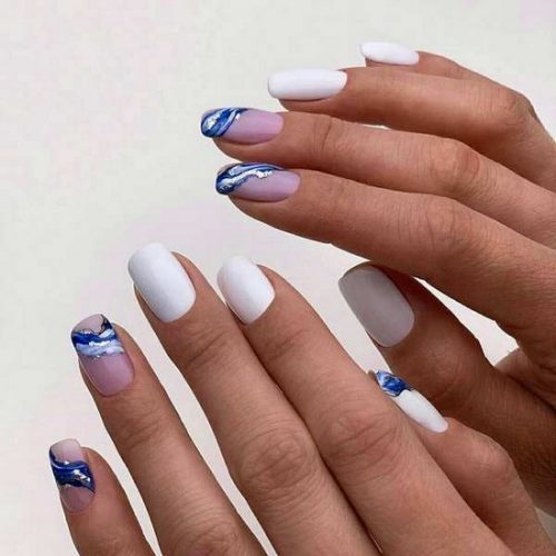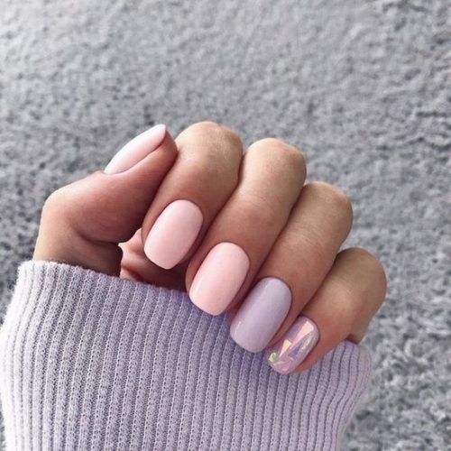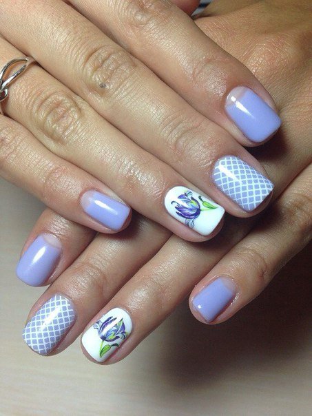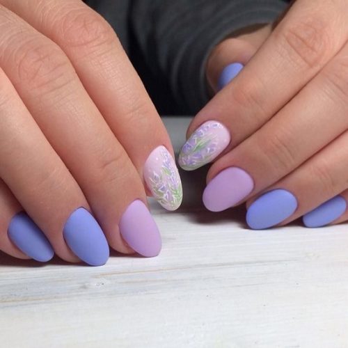 La manucure printemps-été 2025-2026, bleue, lilas et lilas, sera assortie sur les ongles des filles et sera parfaitement combinée avec des teintes de vernis gel blanc, beige, rose pâle, turquoise et menthe.