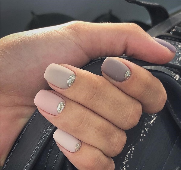 Différentes nuances de vernis contribueront à ajouter une touche ludique à votre nouveau look avec une manucure mate à la mode. Cette approche est devenue une tendance de la mode de manucure, lorsque les maîtres créent des motifs multicolores à droite et à gauche et utilisent également plusieurs teintes de revêtement sur les ongles. Nous vous suggérons de réaliser une si belle manucure mate en utilisant la technique consistant à diviser l’ongle en deux moitiés et à les recouvrir de différentes nuances mates. Ajoutez quelques cristaux et vous obtiendrez une manucure mate originale dans un design à la mode.
