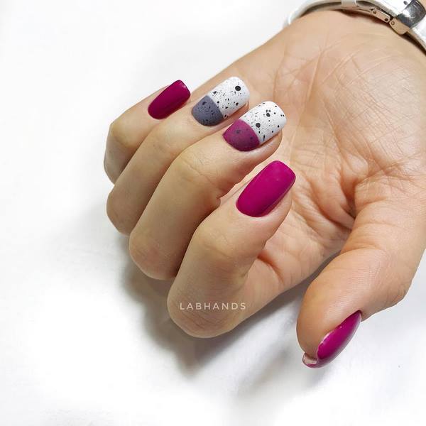Un design très audacieux de manucure avec un motif qui ressemble à l'apparence d'œufs de caille a été proposé par des maîtres des ongles au cours de la prochaine saison. Cette technique à ongles est présentée dans une variété d’idées et de styles de manucure mate. Un revêtement spécial qui vous permet d'obtenir un effet mat recherché et recherché «d'œufs de caille» sur les ongles, que vous pouvez trouver chez Illamasqua. Trendy sera une manucure mate à la mode avec un design similaire en jaune, violet, rose, beige, rouge, vert qui peut être combiné en toute sécurité dans une manucure.