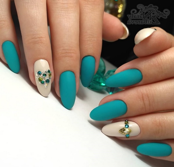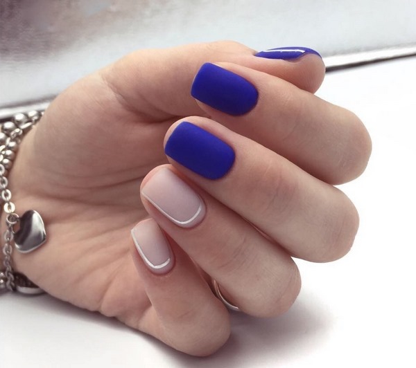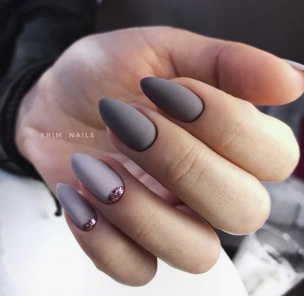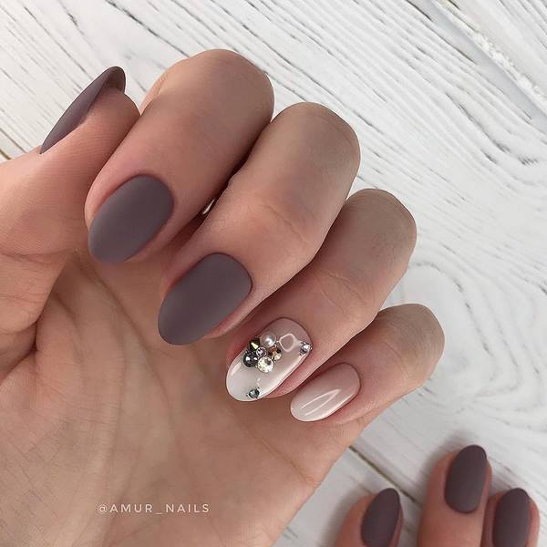 Différentes nuances de vernis contribueront à ajouter une touche ludique à votre nouveau look avec une manucure mate à la mode. Cette approche est devenue une tendance de la mode de manucure, lorsque les maîtres créent des motifs multicolores à droite et à gauche et utilisent également plusieurs teintes de revêtement sur les ongles. Nous vous suggérons de réaliser une si belle manucure mate en utilisant la technique consistant à diviser l’ongle en deux moitiés et à les recouvrir de différentes nuances mates. Ajoutez quelques cristaux et vous obtiendrez une manucure mate originale dans un design à la mode.