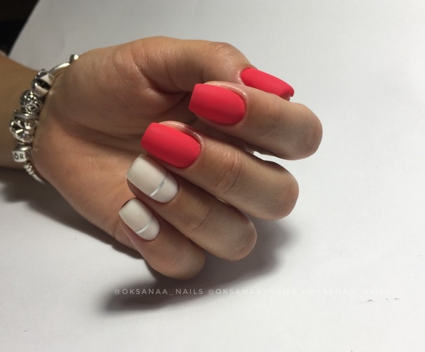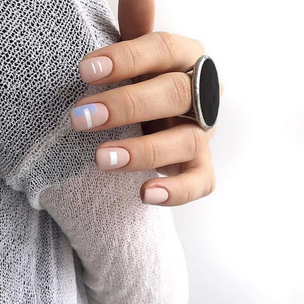 Conception manucure universelle et à la mode que vous obtiendrez avec un minimalisme mat laconique sur les ongles. Il peut s’agir de rayures ou de micro-impressions, de petits motifs floraux et de graphismes concis et originaux. L'avantage de cette conception de clou sera l'aspect que vous pouvez porter un tel "minimalisme" manucure mat à la mode au bureau, et si nécessaire, complétez-les avec n'importe quelle tenue, même festive.