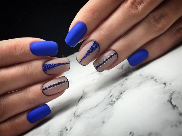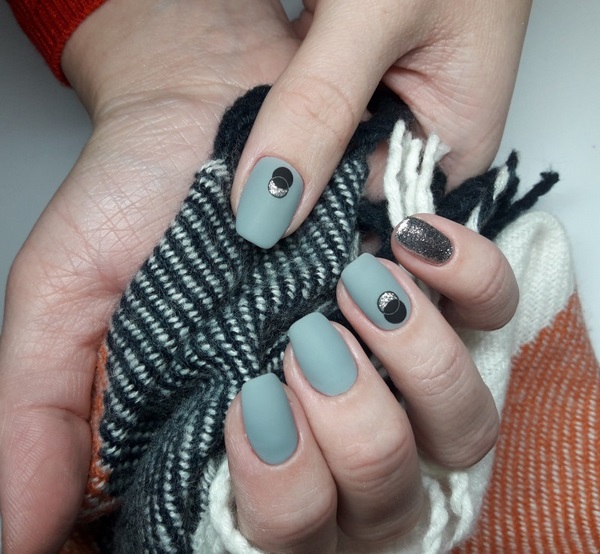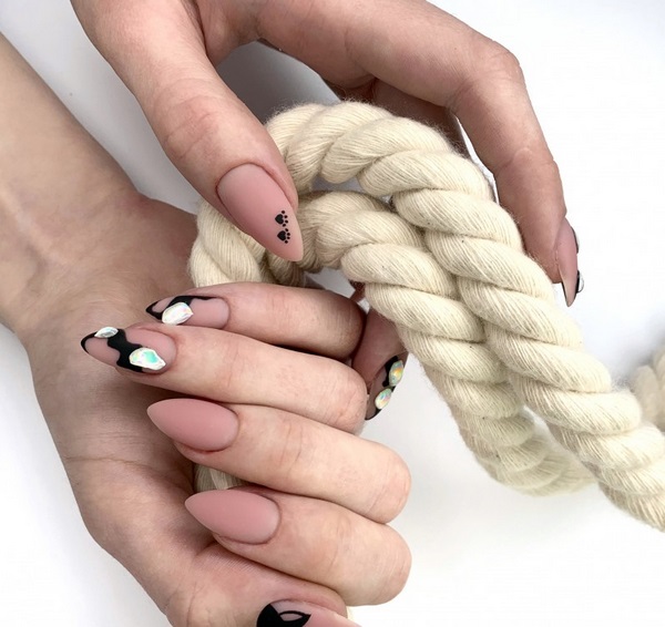 Des strass scintillants dans un design d’ongles à la mode attirent toujours les regards enthousiastes. Une excellente solution sera une manucure mate à la mode avec des cristaux de lutin et des cristaux Swarovski, qui donnera à vos ongles un effet saisissant. Le contraste entre la manucure mate et la brillance des galets sera le choix parfait pour une conception de manucure en soirée. Vous pouvez disposer les galets sur les ongles avec un motif mat de différentes manières - en vrac, dans le coin du souci, sous la forme de figures et de cœurs géométriques.
