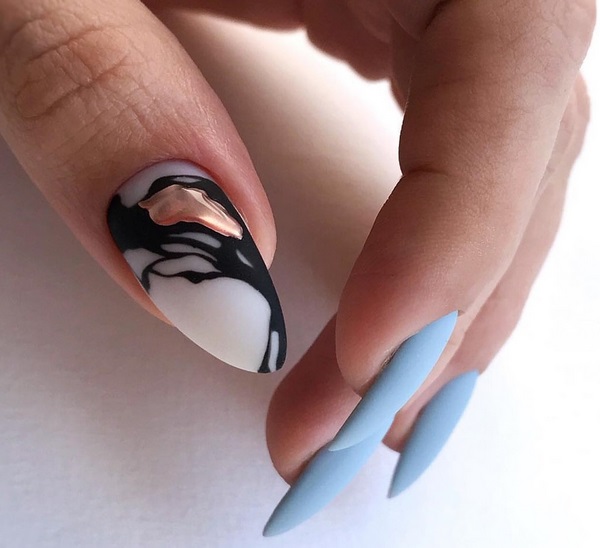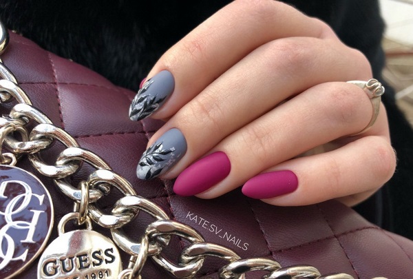 Le design inhabituel de la manucure avec une finition mate peut être obtenu grâce à l’effet du nail art enfumé. La tendance du design des ongles sera l’accent mis sur deux doigts, avec un effet de fumée sur la finition mate des ongles. Pour obtenir un tel design d'artiste enfumé, vous aurez besoin d'une peinture gel, d'une pâte gélifiée et de vernis à vitrail qui vous aideront à réaliser une manucure mate à la mode avec un motif enfumé.