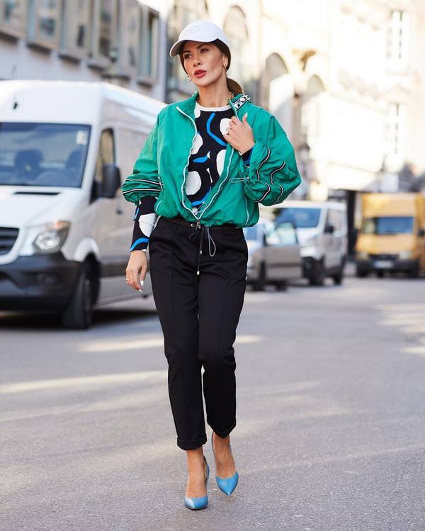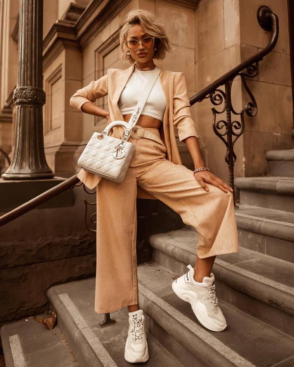 Le style sportif se retrouve dans de nombreux styles de pantalons 2025-2026, tels que les pistes cyclables ou les pantalons à rayures. Il vaut la peine de porter un pantalon à la mode dans cette version avec des blouses et des talons aiguilles, des baskets et des pulls, démontrant ainsi les nouvelles tendances du pantalon dans le style sport-chic.