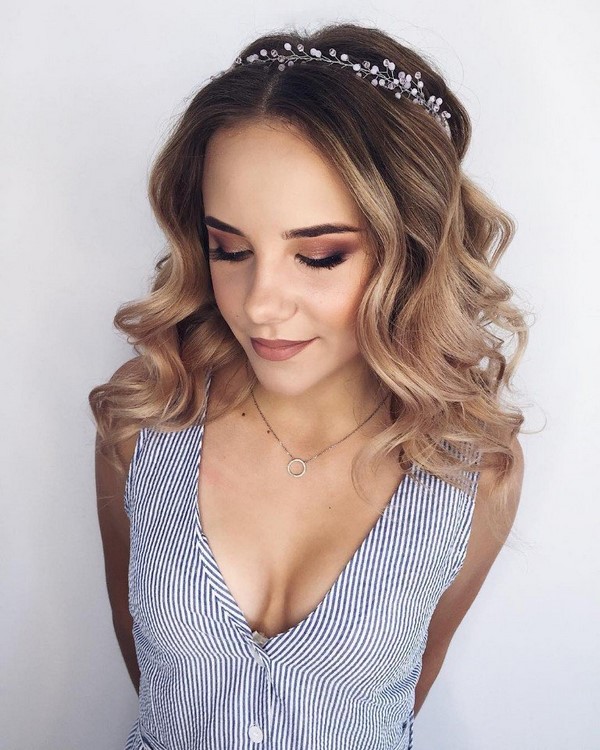 Des cheveux élégamment bouclés avec un fer à repasser ou une pince à épiler seront une excellente idée pour une coiffure de graduation à la mode. Dans le même temps, vous pouvez toujours ajouter des boucles à la graduation avec vos fleurs ou chaînes préférées, épingles à cheveux, bandeaux, bandages et décor avec des cristaux.