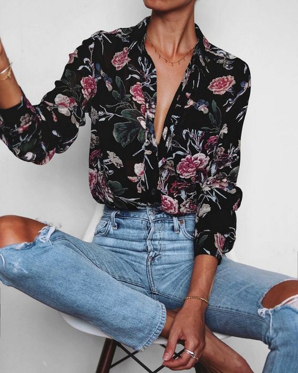 Une attention particulière est accordée aux nœuds avec des chemises dans un design floral, qui sont très féminines et romantiques. Les chemises à fleurs 2025-2026 conviennent parfaitement aux ensembles avec jupes: mini, crayon, sol et midi, ainsi que jeans et pantalons.
