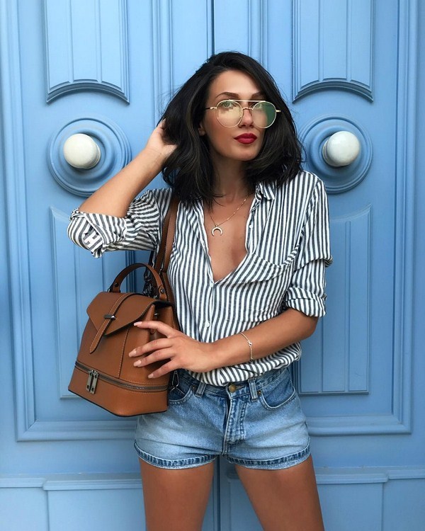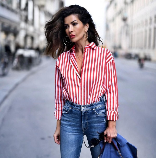 Les chemises à rayures élégantes ne sont pas moins populaires. En particulier, la combinaison de nuances de blanc et de bleu confère un charme et une légèreté particuliers aux interprétations des tendances avec les chemises 2025-2026. Des chemises à rayures foncées, des chemises blanches et croisées, ainsi qu'une rayure noire sur une chemise claire seront intéressantes, qui viendront parfaitement compléter les images avec des vêtements en jean.