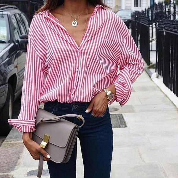 Les chemises oversize pour femmes élégantes devraient toujours être portées à l'intérieur des jeans, qui peuvent être à taille haute, des jeans classiques, des jeans droits ou des petits amis, qui seront au sommet de la popularité en 2025-2026.