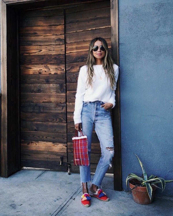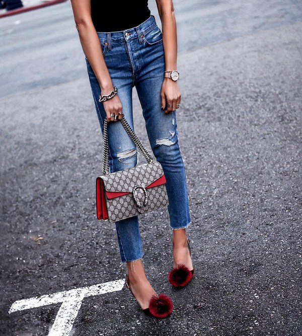 Un jean tendance peut être complété par un pull, un cardigan, une cape, etc., et des chaussures à talons hauts, comme le rouge, vous donneront un look très élégant. En outre, de simples bateaux et des sandales deviendront un complément important pour la peau.