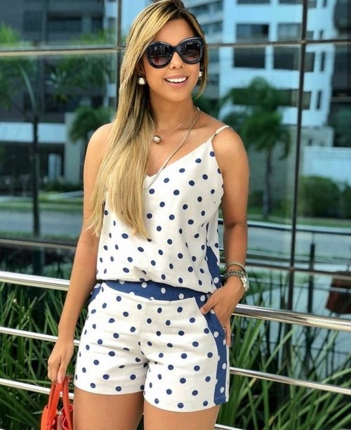 Parmi les tendances énumérées, le look le plus tendre et le plus sensuel est celui des costumes à la mode avec des shorts, décorés avec des pois.