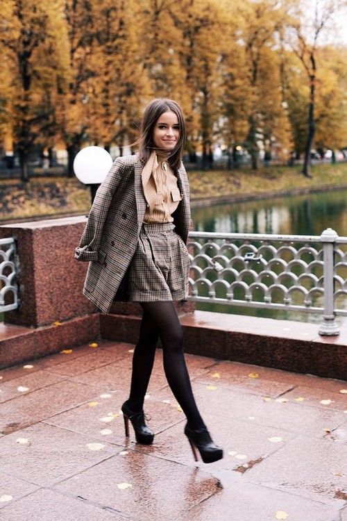 Les tenues analysées sont également belles pour la saison automne-hiver, où des costumes chauds et serrés avec des shorts en tandem avec des vestes, des cardigans et des cardigans allongés ont été offerts à la cour des fashionistas.