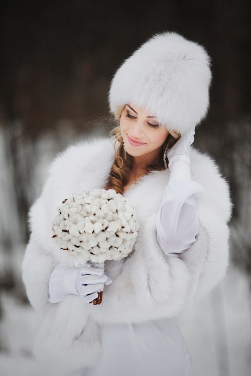 Les éléments de mariage de la garde-robe peuvent être complétés par des accessoires et des décorations de mariage, mais si vous souhaitez porter un manteau de fourrure blanc plus loin, il est préférable de choisir une version laconique et sobre d'un manteau de fourrure de renard et de vison qui vous réchauffera pendant le mariage et ne restera pas pendant un jour.