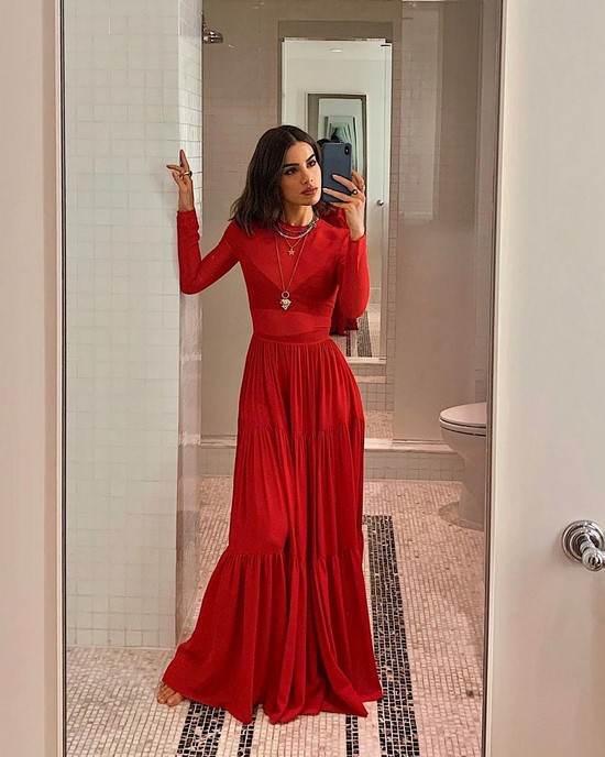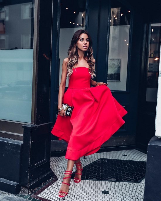 Les robes rouges chics seront exactement rouges, ce qui a été présenté par les créateurs dans une version évasée unique avec une longueur exquise juste au-dessous du genou.