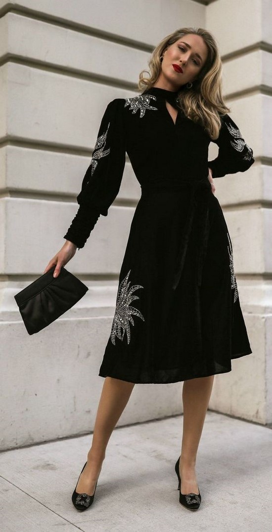 De célèbres couturiers ont offert aux dames un vêtement du Nouvel An avec une encolure style maxi et midi, des solennelles robes du Nouvel An avec une encolure carrée et une encolure en V à manches longues, ainsi que des robes incroyablement spectaculaires en velours avec une encolure et des manches à demi manches.